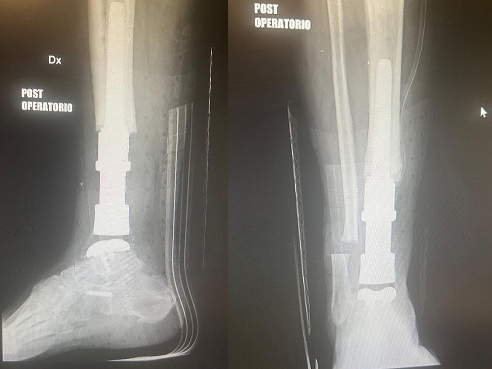 restored articulation with the tibial replacement, allowing preserved ankle motion. Intraoperative stability was excellent, and no technical
