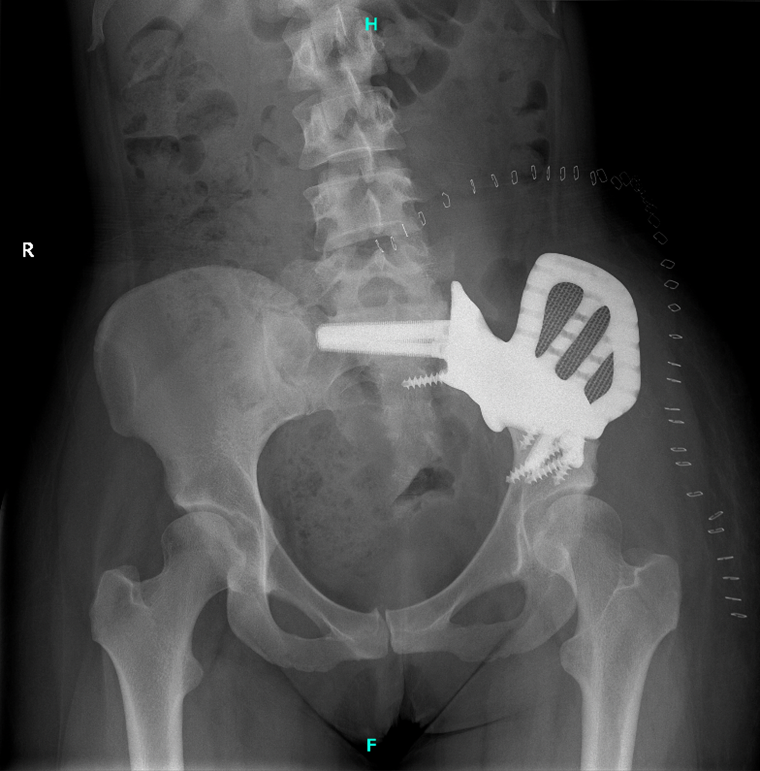 A custom sacroiliac joint replacement was then implanted with secure anchorage in the ilium and sacrum.