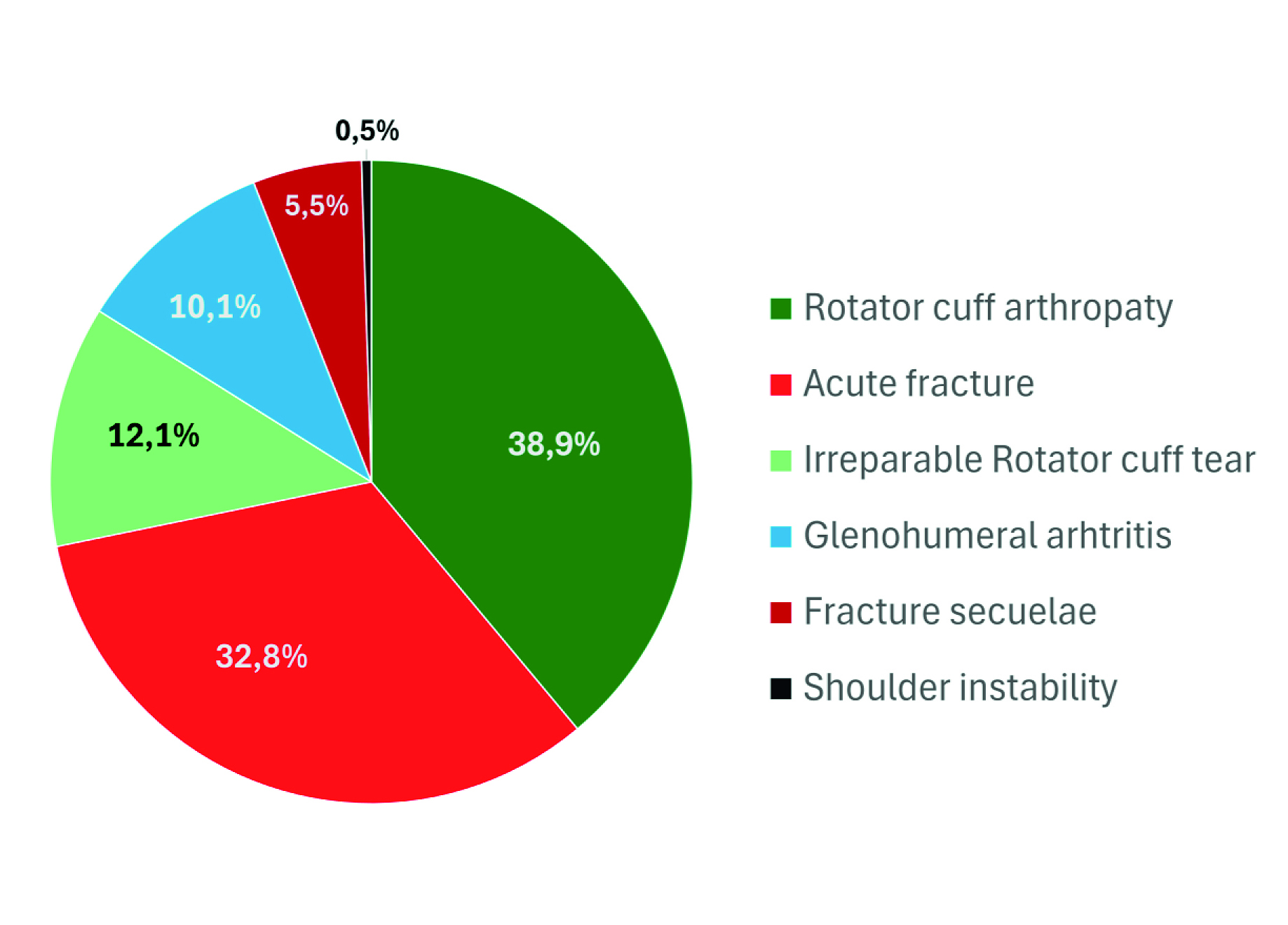 The cohort comprised 219 consecutive primary RSAs, with 198 patients (90.4%) completing the 12-month follow-up. Indications reflected routine practice: cuff-tear arthropathy and acute proximal humerus fractures predominated, followed by irreparable rotator cuff tears, primary osteoarthritis, and fracture sequelae. The program was led by M. Á. Ruiz-Ibán (Madrid), P. Cañete Pastor (Manises/Valencia), E. Melendreras (Murcia), and M. Hermida (Santiago de Compostela). The cohort included 51 men and 147 women; mean age was 72.3 ± 8.02 years. Clinical and radiological data, complications, and reinterventions were recorded intraoperatively and at six weeks and one year follow-up. Across the four centers, the combination of a high 12-month