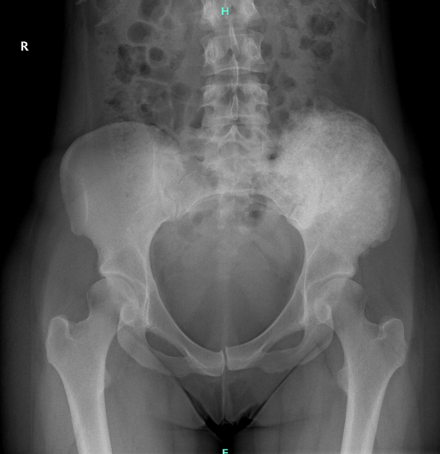 Figure 1: Preoperative pelvic X-ray showing a giant cell tumor in the left iliac wing