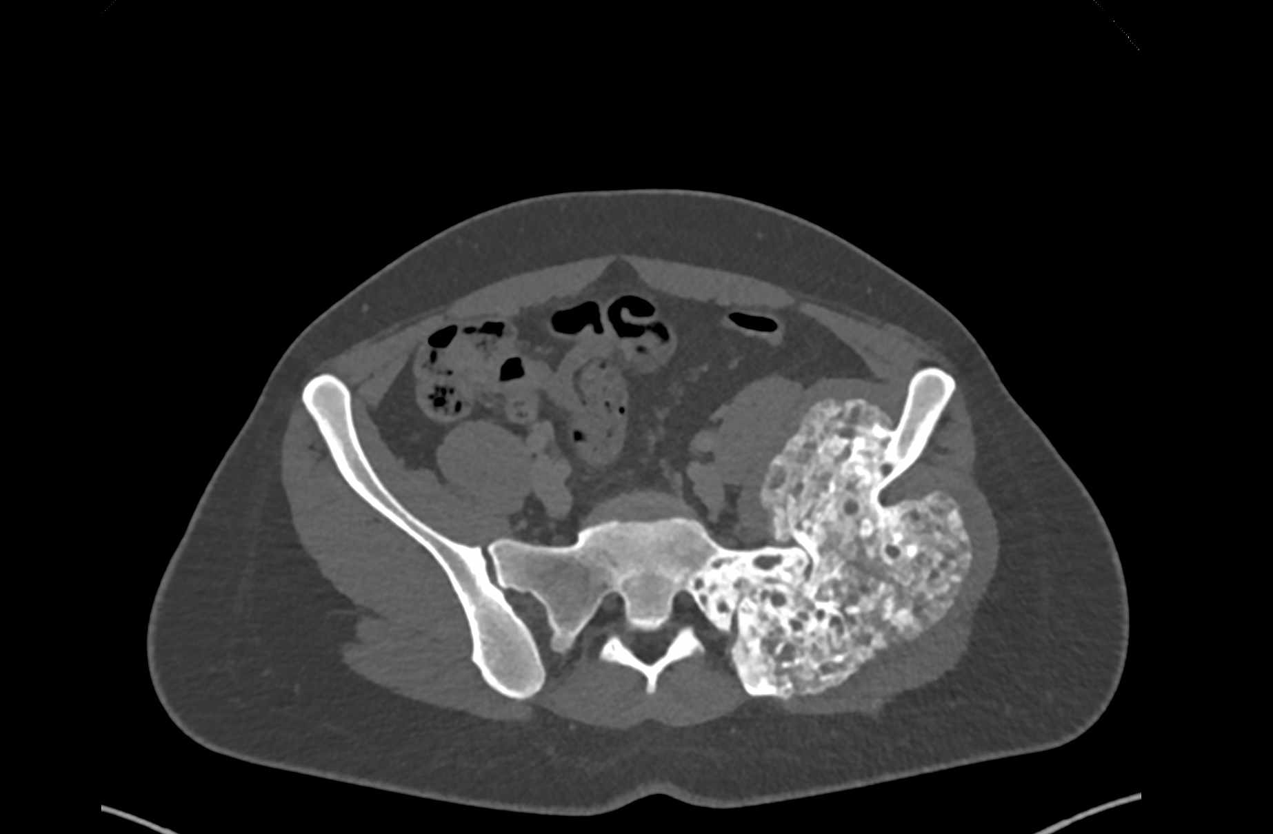A 27-year-old female patient presented with a giant cell tumor of the left iliac wing that extended into the sacrum. After one year of neoadjuvant DENOSUMAB therapy,
