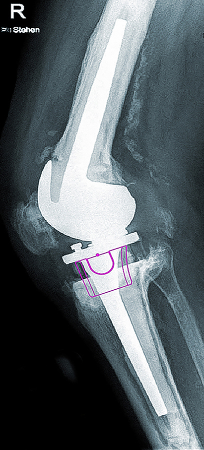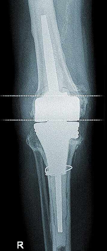 After the primary implantation of a knee joint prosthesis in 2003, an inlay change in 2004 and a revision of the knee prosthesis in 2011, due to implant loosening, to a LINK Endo-Model rotational knee prosthesis with tibial LinkSpacer, the patient presented in 2017 due to persistent discomfort. The X-ray examination revealed a renewed loosening of the tibial, while the diagnostic arthrocentesis revealed nothing abnormal. Since the primary care clinic refused another revision due to the complexity of the procedure, the patient was referred to the Orthopedic Clinic of the Hanover Medical School in the DIAKOVERE Annastift.