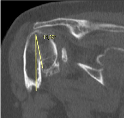 - Elevation 40°, abduction 30°, very low rotation