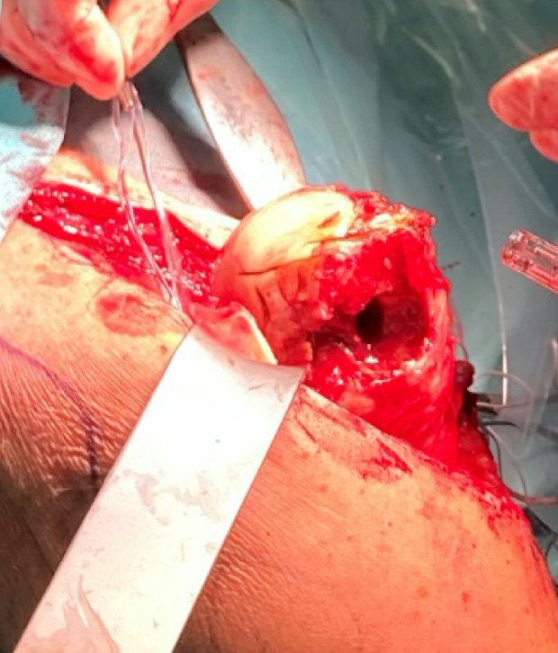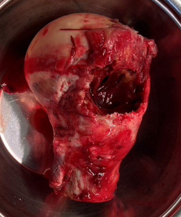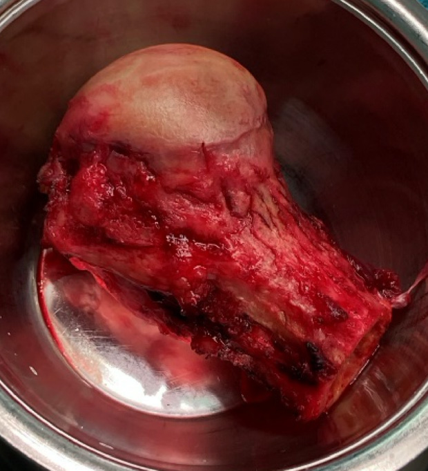 Picture 5, 6, 7: Exposure of humeral head, resected head and defect