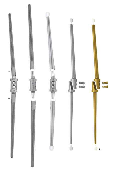 The stems of the cemented version are tapered, but have three flat planes for anti-rotation securing in the cement bed. The implant components are given an anatomical curvature of 5° flexion immediately after coupling. Centralizers ensure correct intramedullary positioning at each end of the nail.