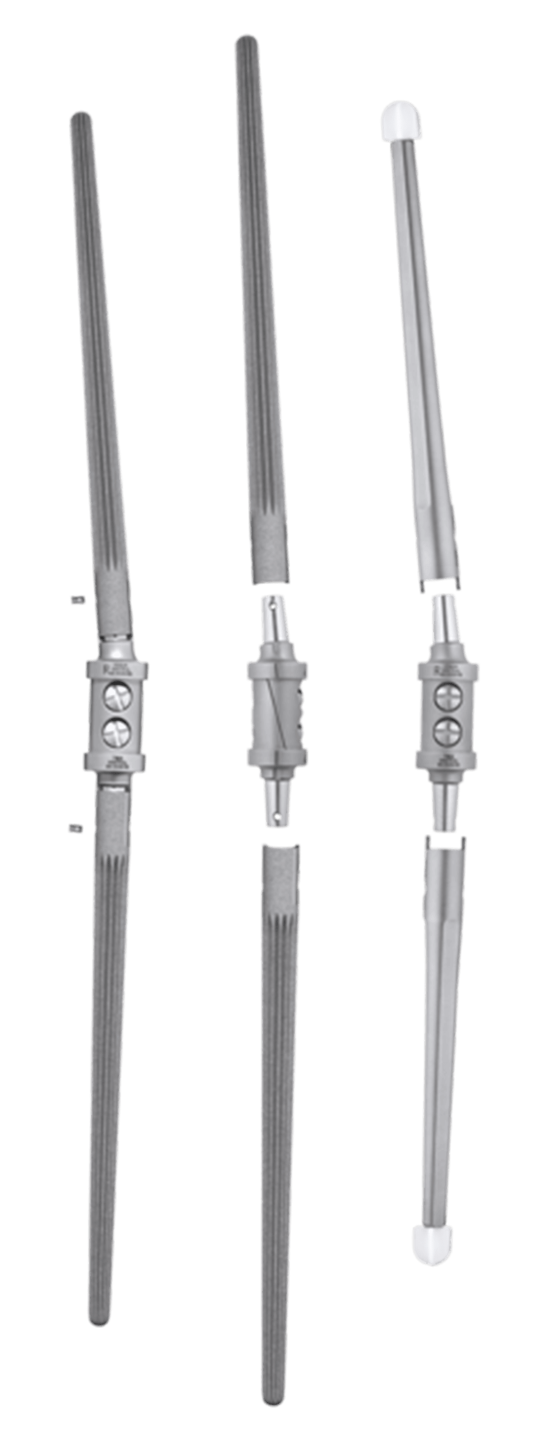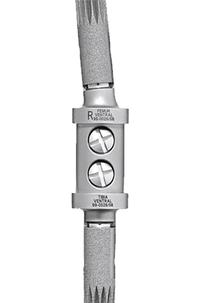 The stems of the cemented version are tapered, but have three flat planes for anti-rotation securing in the cement bed. The implant components are given an anatomical curvature of 5° flexion immediately after coupling. Centralizers ensure correct intramedullary positioning at each end of the nail.
